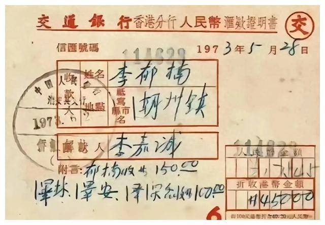 在浏览头条新闻时,我看到一张汇款单的图片,显示的是李嘉诚1973年5月28日给广东老家的亲戚朋友汇款450元港币。单子上还特别注明了给李郁楠150元,其他亲人泽林、泽安、泽深各100元。泽字辈的亲戚可能是他的侄儿们,而郁字辈的则可能是长辈。