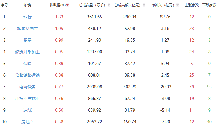 板块方面,银行、旅游及酒店、贸易等板块涨幅居前,能源金属、贵金属、电机等板块跌幅居前。