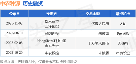 证券之星消息,根据天眼查APP于11月2日公布的信息整理,中农种源(深圳)科技有限公司A轮融资,融资额亿级人民币,参与投资的机构包括松禾资本,三泽创投。