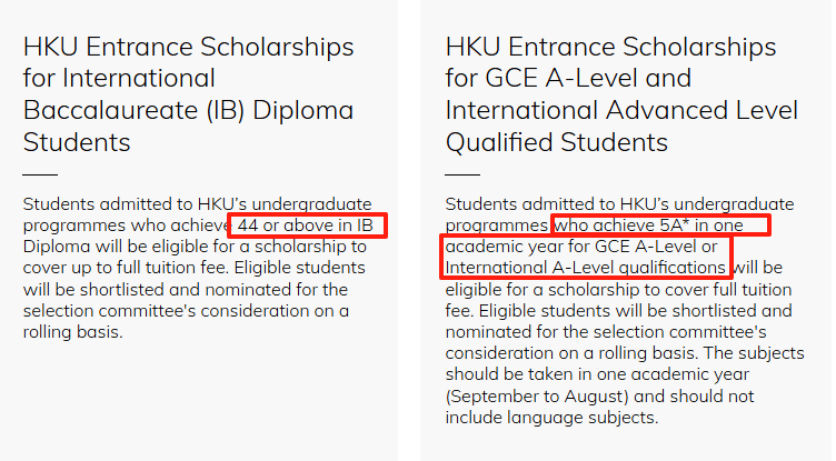 港大入学奖学金无需申请。符合条件的学生将被自动考虑(条件:A-level申请者成绩需同一学年考出5个A* (科目不包括语言类);IB需44分);