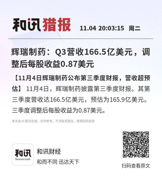 【11月4日辉瑞制药公布第三季度财报,营收超预估】11月4日,辉瑞制药披露第三季度财报。其第三季度营收达166.5亿美元,预估为165.9亿美元。三季度调整后每股收益为0.87美元。