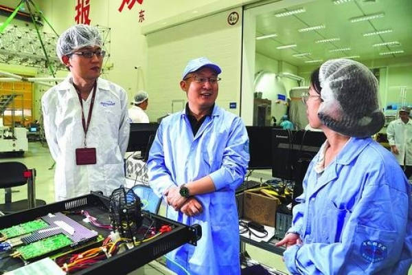 胡海鹰(中)与同事在车间讨论型号研制问题。图源:中国科学报