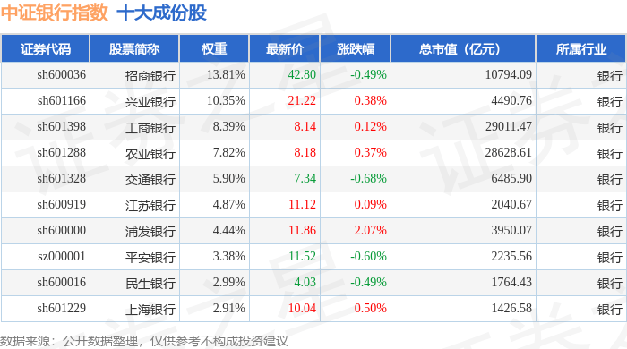 证券之星消息,11月5日,中证银行(399986)指数报收于7783.34点,跌0.01%,成交335.95亿元,换手率0.31%。当日该指数成份股中,上涨的有14家,浦发银行以2.07%的涨幅领涨,下跌的有26家,厦门银行以2.26%的跌幅领跌。