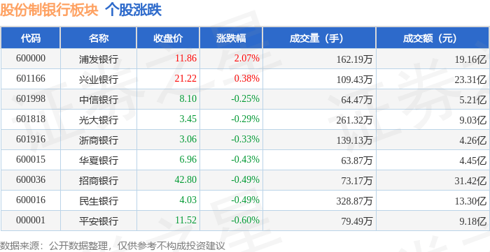 证券之星消息,11月5日股份制银行板块较上一交易日上涨0.05%,浦发银行领涨。当日上证指数报收于3969.25,上涨0.23%。深证成指报收于13223.56,上涨0.37%。股份制银行板块个股涨跌见下表: