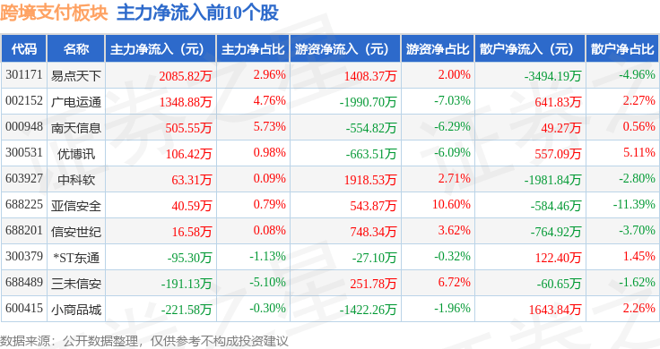 从资金流向上来看,当日跨境支付板块主力资金净流出18.1亿元,游资资金净流入1.34亿元,散户资金净流入16.76亿元。跨境支付板块个股资金流向见下表: