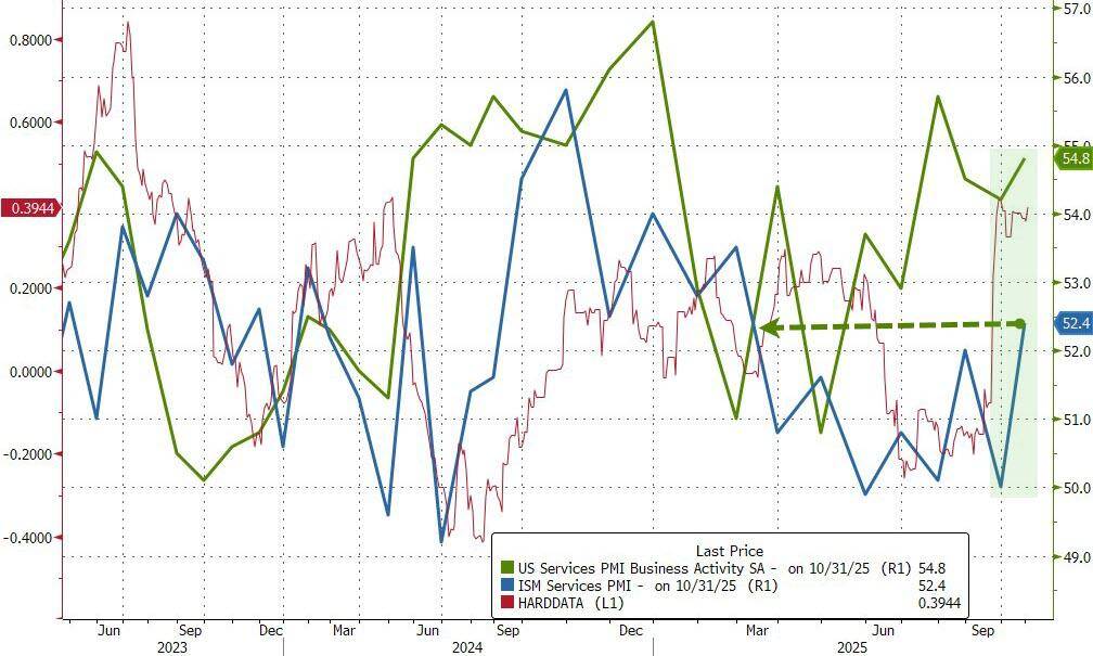 美国10月ISM服务业PMI指数52.4,预期50.8,前值50。50为荣枯分水岭。此次数据高于媒体调查的所有经济学家的预测。
