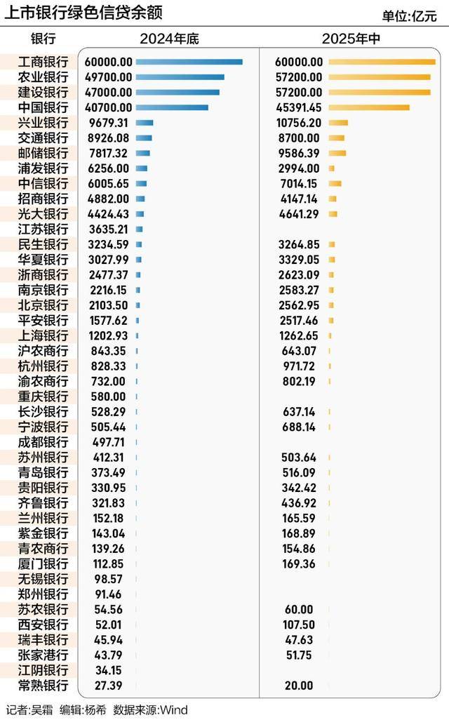 其中,国有大型银行仍为绿色信贷主力,六大国有银行合计绿色信贷余额突破21万亿元,占全部A股上市银行总额的77.6%;股份制银行增速迅猛,部分城农商行在细分领域实现高增长,呈现“大行稳规模、股份行强活力、区域行快增长”的格局。