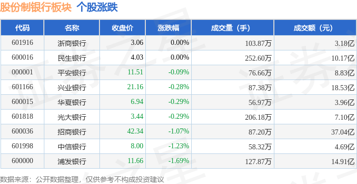 证券之星消息,11月6日股份制银行板块较上一交易日下跌0.81%,浦发银行领跌。当日上证指数报收于4007.76,上涨0.97%。深证成指报收于13452.42,上涨1.73%。股份制银行板块个股涨跌见下表: