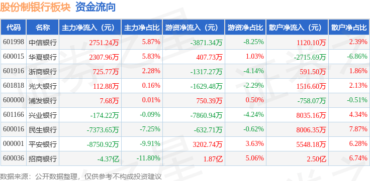 从资金流向上来看,当日股份制银行板块主力资金净流出5.41亿元,游资资金净流入7786.75万元,散户资金净流入4.63亿元。股份制银行板块个股资金流向见下表: