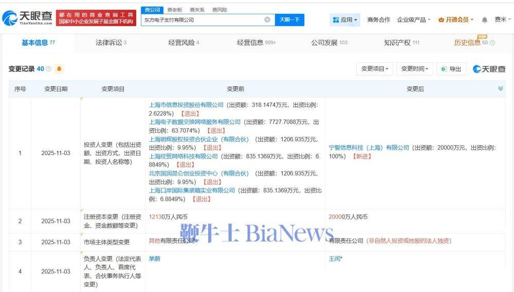 11月6日,天眼查工商信息显示,近日,支付机构东方电子支付有限公司已由宁智信息科技(上海)有限公司100%控股。