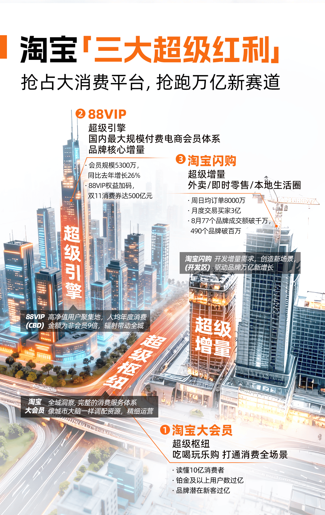 此前,淘宝平台总裁处端在双11发布会上表示,淘宝大会员覆盖超10亿用户,打通吃喝玩乐、衣食住行等多个消费场景,其中铂金及以上用户已超1亿,年消费天数超过90天,购买力强劲,为品牌带来高频触达高价值用户的新机会。