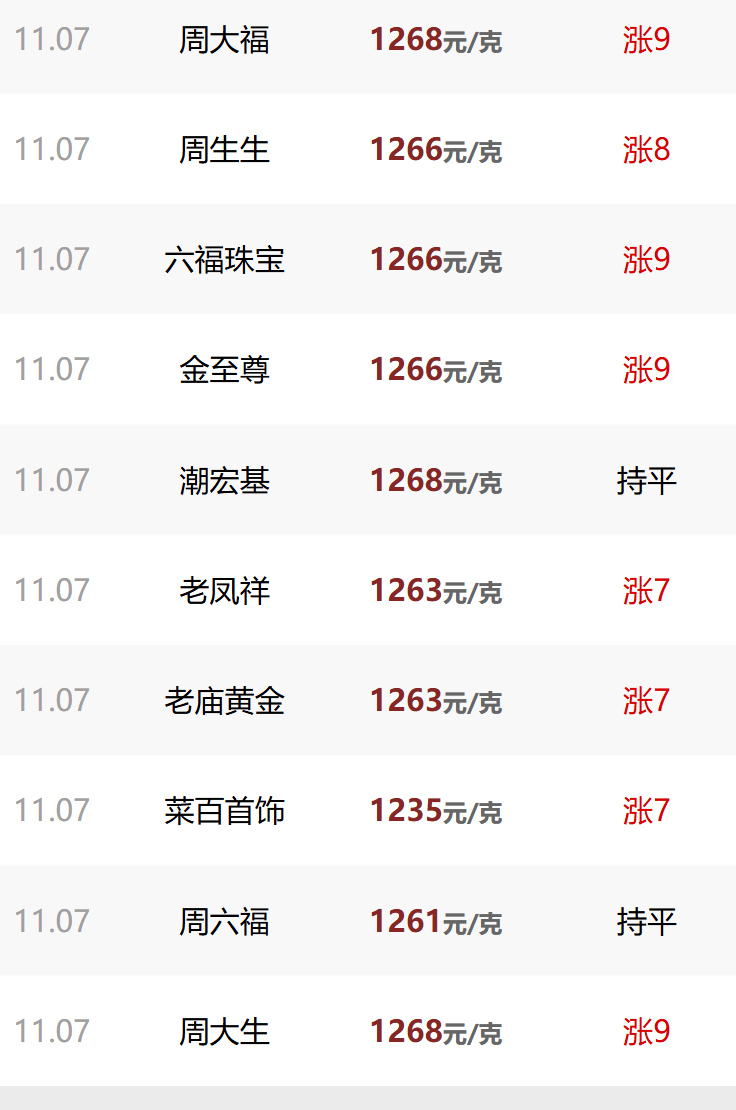11月7日,国内品牌金饰价格普遍小幅上调。