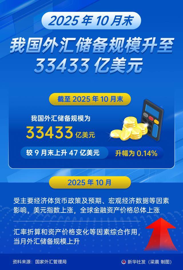 图表丨2025年10月末我国外汇储备规模升至33433亿美元