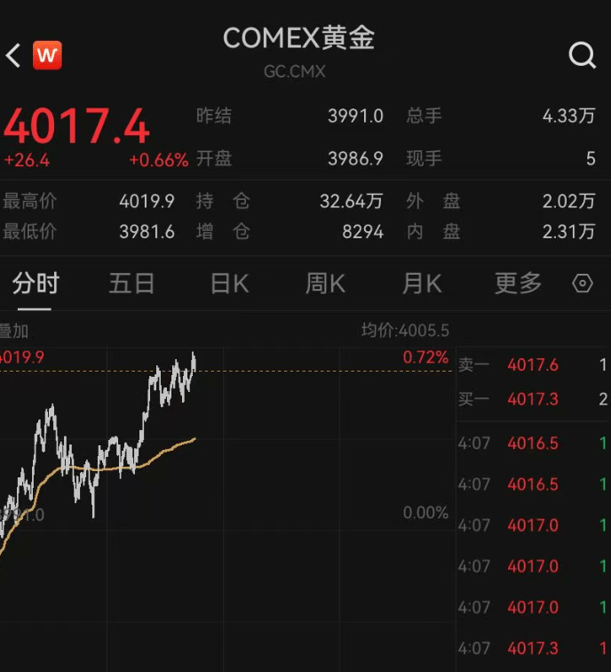 纽约期金价格报4013.1美元/盎司,日内涨0.66%。