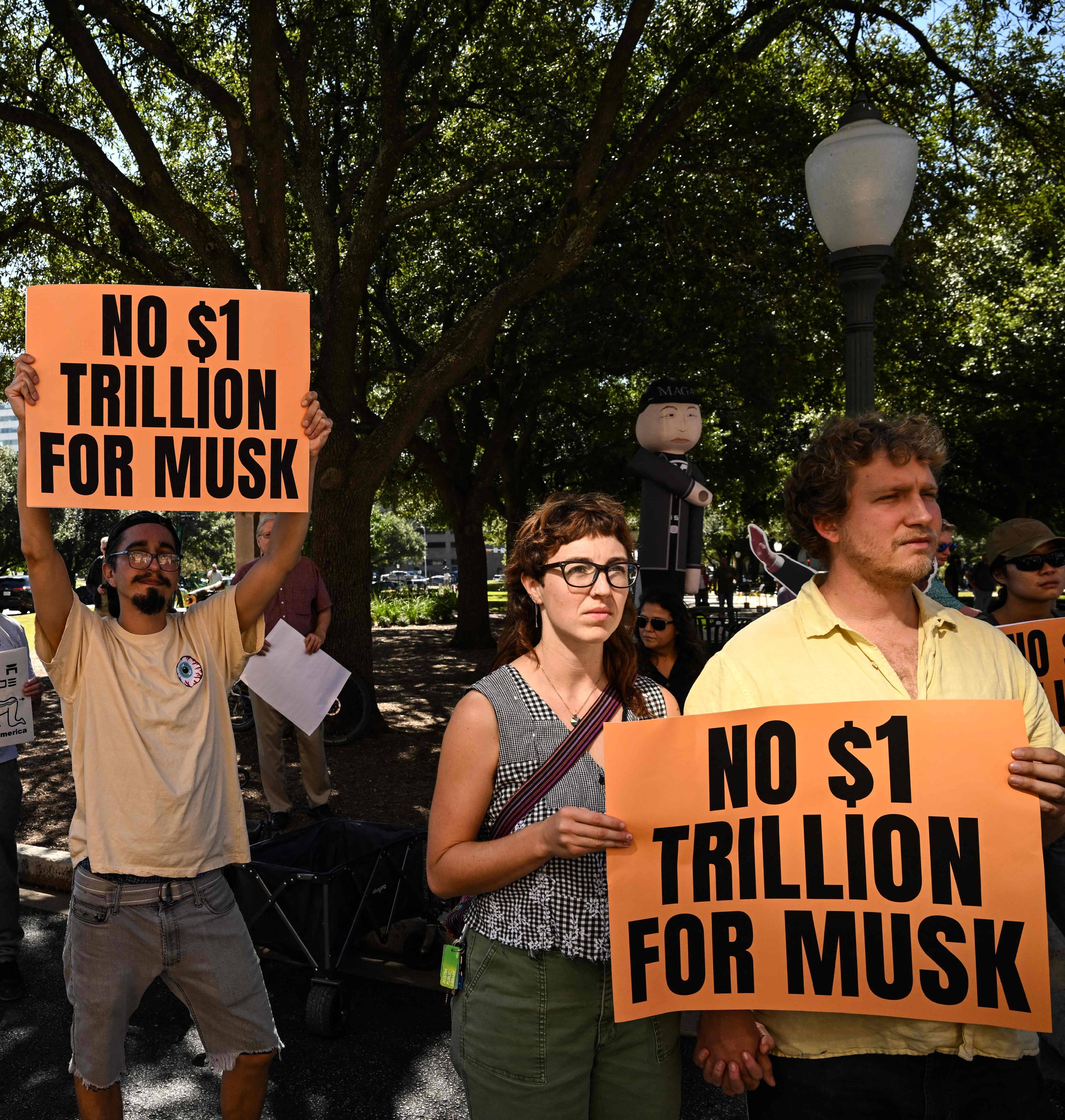 5日,得克萨斯州奥斯汀的一些抗议者反对马斯克的巨额薪酬方案。(法新社)