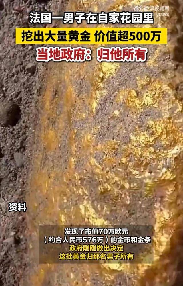 法国地方政府官员11月6日称,一名法国男子今年上半年在自家花园里挖游泳池时发现了市值70万欧元的金币和金条。政府刚刚作出决定,这批黄金归那名男子所有。