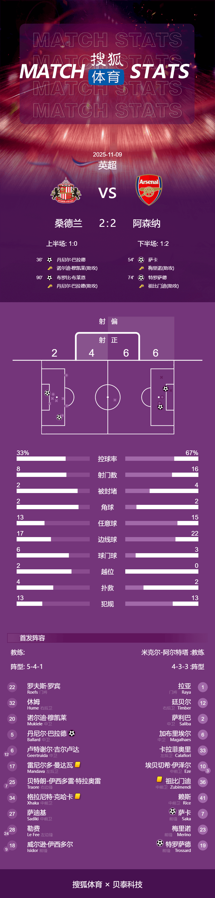 阿森纳(4231):1-拉亚/12-廷贝尔、2-萨利巴、6-加布里埃尔、33-卡拉菲奥里/36-苏比门迪、41-赖斯/10-埃泽(第88分钟,3-莫斯克拉)、19-特罗萨德、7-萨卡/23-梅里诺