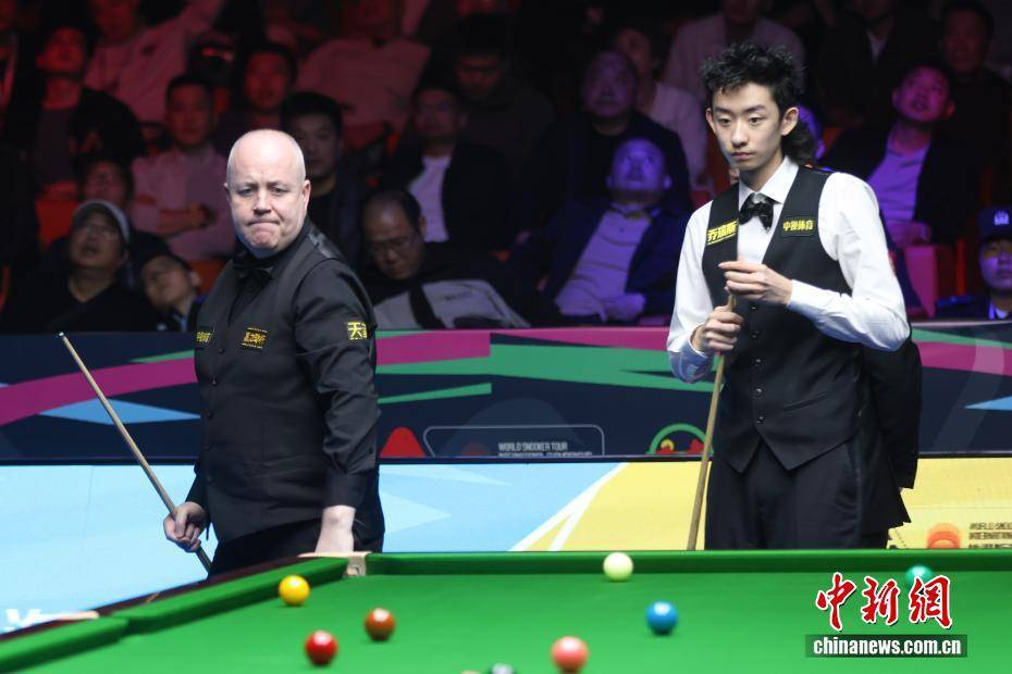 11月9日晚,在南京举行的2025世界斯诺克巡回赛国际锦标赛决赛中,中国小将吴宜泽击败老将约翰·希金斯,夺得冠军。图为吴宜泽(右)与约翰·希金斯在比赛中。中新社记者 泱波 摄