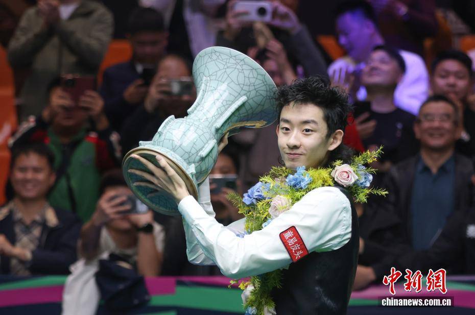 11月9日晚,在南京举行的2025世界斯诺克巡回赛国际锦标赛决赛中,中国小将吴宜泽击败老将约翰·希金斯,夺得冠军。图为吴宜泽捧起冠军奖杯。中新社记者 泱波 摄