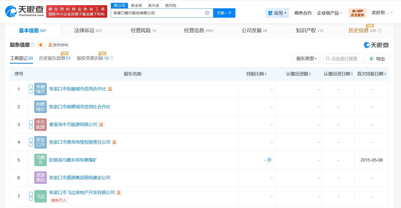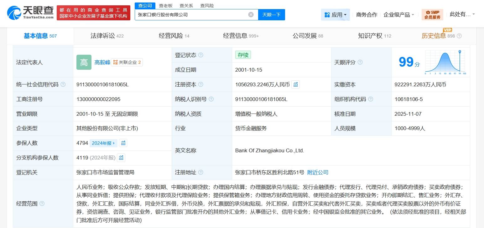 天眼查工商信息显示,近日,张家口银行股份有限公司发生工商变更,注册资本由约92.2亿人民币增至约105.6亿人民币,增幅约14.5%。