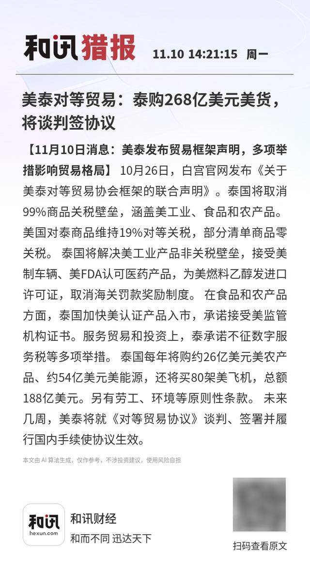 【11月10日消息:美泰发布贸易框架声明,多项举措影响贸易格局】10月26日,白宫官网发布《关于美泰对等贸易协会框架的联合声明》。泰国将取消99%商品关税壁垒,涵盖美工业、食品和农产品。美国对泰商品维持19%对等关税,部分清单商品零关税。 泰国将解决美工业产品非关税壁垒,接受美制车辆、美FDA认可医药产品,为美燃料乙醇发进口许可证,取消海关罚款奖励制度。 在食品和农产品方面,泰国加快美认证产品入市,承诺接受美监管机构证书。服务贸易和投资上,泰承诺不征数字服务税等多项举措。 泰国每年将购约26亿美元美农产品、约54亿美元美能源,还将买80架美飞机,总额188亿美元。另有劳工、环境等原则性条款。 未来几周,美泰将就《对等贸易协议》谈判、签署并履行国内手续使协议生效。