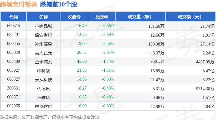 从资金流向上来看,当日跨境支付板块主力资金净流出10.59亿元,游资资金净流入9382.02万元,散户资金净流入9.65亿元。跨境支付板块个股资金流向见下表:
