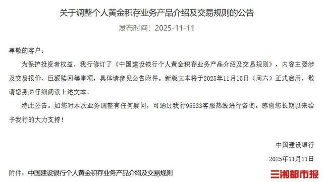 当日,中国建设银行也发布公告称,为保护投资者权益,修订了《中国建设银行个人黄金积存业务产品介绍及交易规则》,内容主要涉及交易报价、巨额赎回等事项。同时,黄金积存计划的日积存起点金额由此前的1000元上调为1200元。新版文本将于11月15日(周六)正式启用。