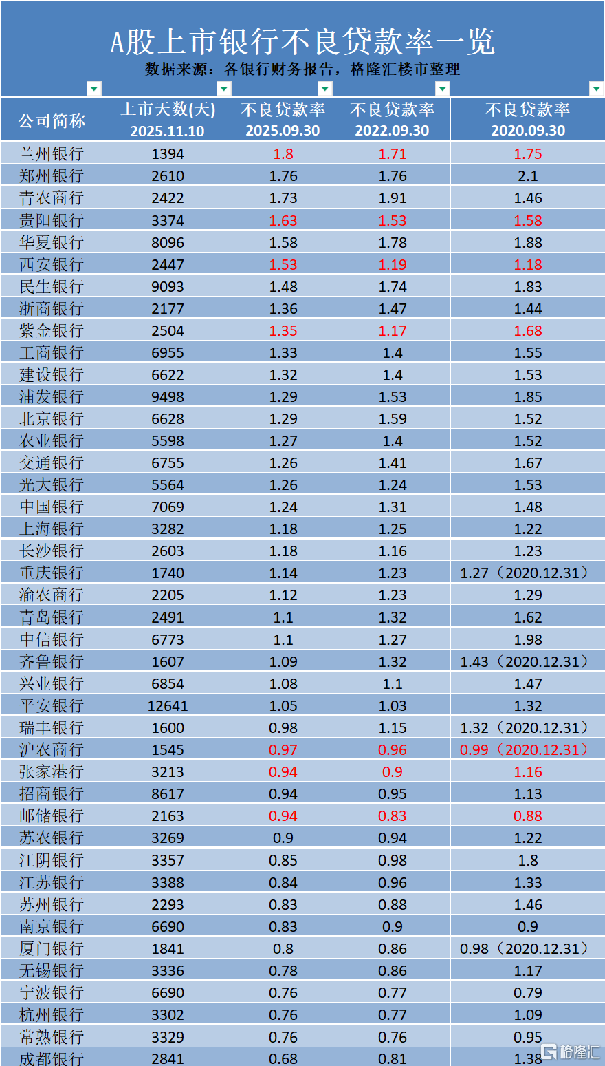 根据42家上市银行公开的财报,相比2020年三季度的不良率,2025年上市银行集体的不良率几乎都出现了下降。