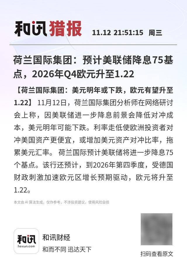【荷兰国际集团:美元明年或下跌,欧元有望升至1.22】11月12日,荷兰国际集团分析师在网络研讨会上称,因美联储进一步降息前景会降低对冲成本,美元明年可能下跌。利率走低使欧洲投资者对冲美国资产更便宜,或增加美元资产对冲比率,拖累美元汇率。荷兰国际预计美联储将进一步降息75个基点。该行还预计,到2026年第四季度,受德国财政刺激加速欧元区增长预期驱动,欧元将升至1.22。