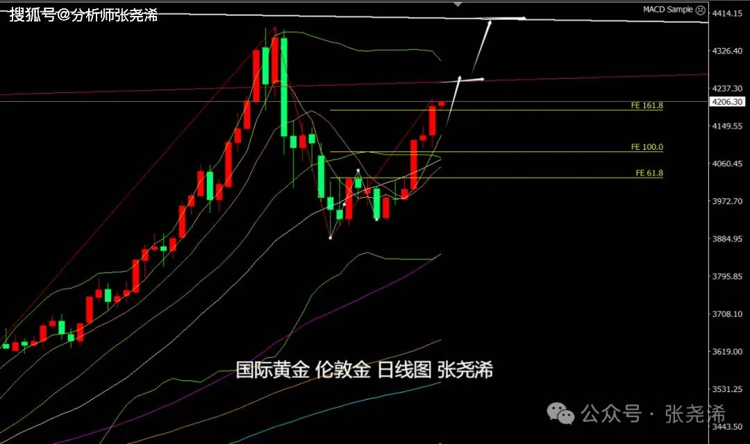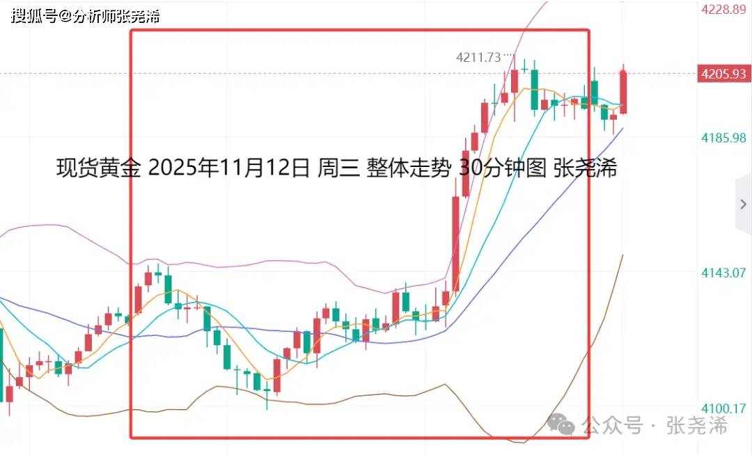 上交易日周三(11月12日):国际黄金如期继续反弹收阳,稳于中轨及30日均线上方,多头占据优势,后市将进一步等待触及4250美元或4400美元预期目标。目前来看,后续到年底走势,要么维持高位宽幅震荡,要么持续走强攀升。