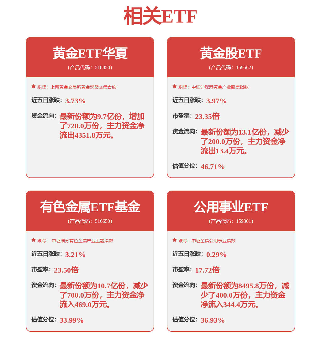 11月13日,三大股指早盘窄幅震荡,其中黄金板块持续拉升。截至上午9:40,黄金ETF华夏(518850)涨1.35%、黄金股ETF(159562)涨1.79%。相关成分股中铜陵有色涨2.50%、紫金矿业涨2.14%、中金黄金涨1.55%,山东黄金、湖南黄金、赤峰黄金等小幅跟涨。