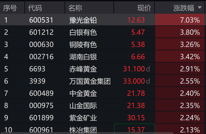 今日开盘,中证沪深港黄金产业股票指数(931238)强势上涨2.04%,成分股豫光金铅涨超7%,白银有色,铜陵有色,湖南白银等个股跟涨。