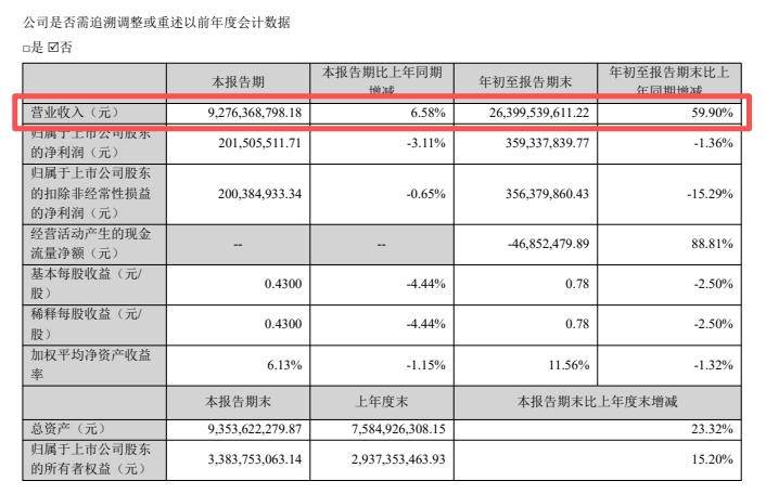截至三季度末,公司总资产达93.54亿元,较上年末增长23.32%,归属于上市公司股东的所有者权益33.84亿元,较上年末增长15.20%,资产负债率从去年同期的68.77%降至63.27%,财务结构持续趋于稳健。