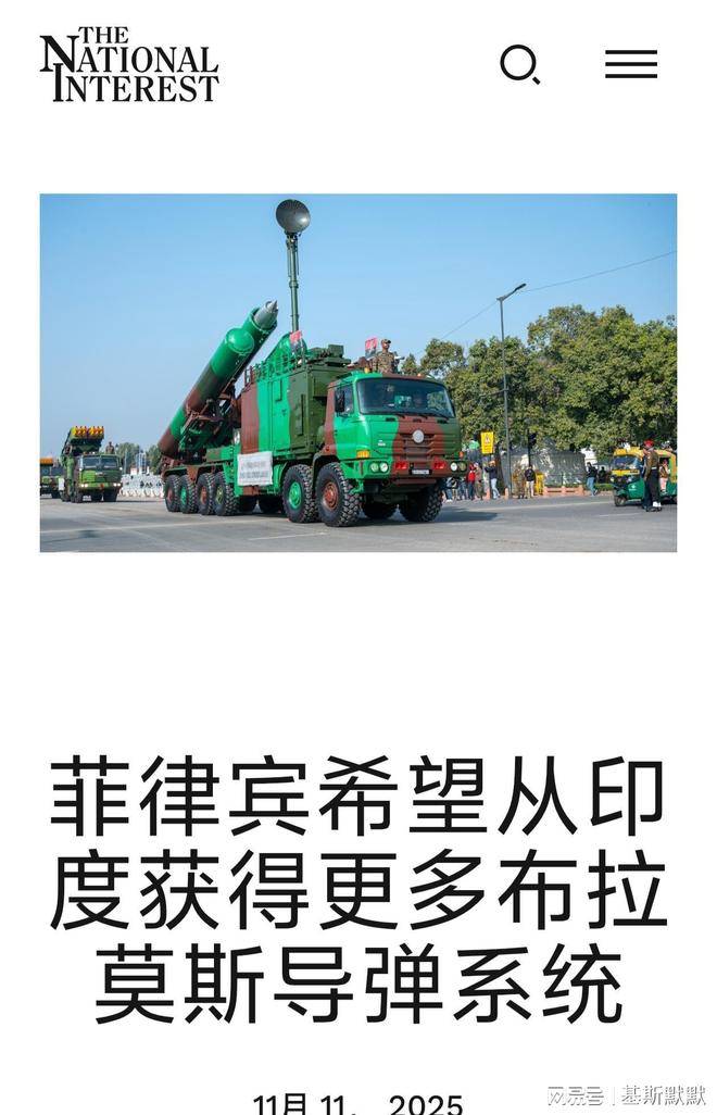 据美国《国家利益》网站11月11日报道,菲律宾计划增加采购由印度和俄罗斯联合设计制造的“布拉莫斯”反舰导弹(岸基版)。报道称,印度似乎非常愿意向菲律宾提供这一先进导弹系统,至少其中一个原因是,这些导弹的潜在目标可能与两国共同的假想敌相关。