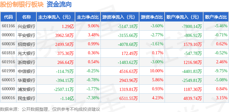 从资金流向上来看,当日股份制银行板块主力资金净流入5684.08万元,游资资金净流入1599.28万元,散户资金净流出7283.37万元。股份制银行板块个股资金流向见下表: