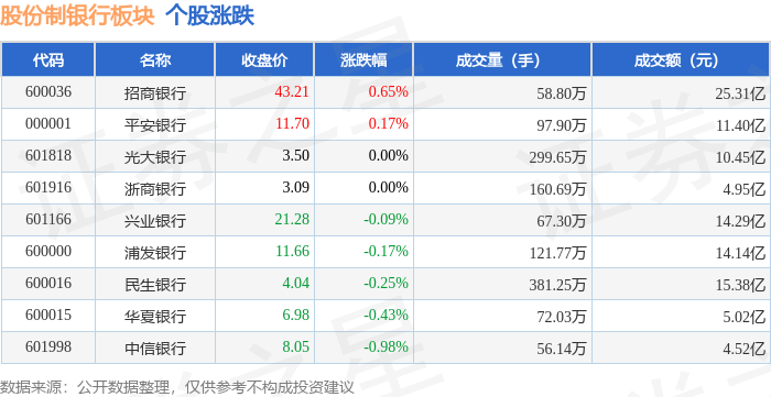 证券之星消息,11月13日股份制银行板块较上一交易日上涨0.04%,招商银行领涨。当日上证指数报收于4029.5,上涨0.73%。深证成指报收于13476.52,上涨1.78%。股份制银行板块个股涨跌见下表: