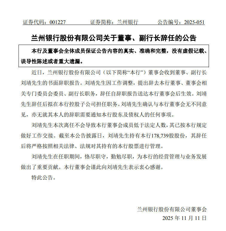 11月11日,兰州银行股份有限公司(001227.SZ,下称“兰州银行”)发布公告称,近日,董事会收到董事、副行长刘靖的书面辞职报告。刘靖因工作调整,提出辞去董事、董事会相关专门委员会委员、副行长职务,辞任自辞职报告送达董事会后生效。刘靖辞任后拟在兰州银行控股子公司担任职务。刘靖确认与董事会无不同意见,亦无就其本人的辞职需要通知兰州银行股东及债权人的任何事项。