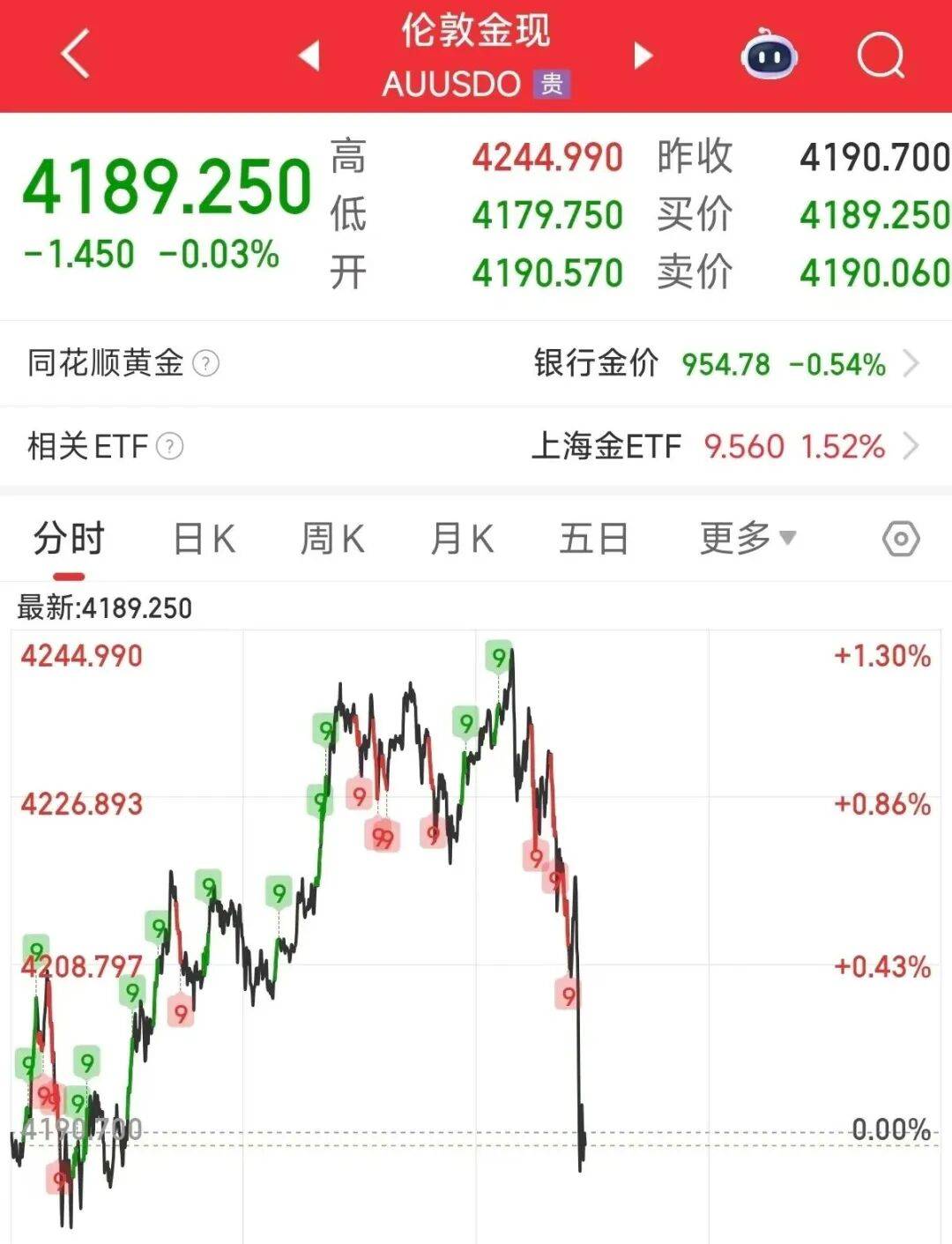 11月13日晚,现货黄金短线走低,跌破4200美元/盎司。现货白银日内跌幅扩大至1%,报52.7美元/盎司。