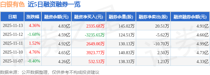 白银有色融资融券信息显示,融资方面,当日融资买入1.29亿元,融资偿还1.06亿元,融资净买入2335.68万元。融券方面,融券卖出31.36万股,融券偿还10.85万股,融券余量145.02万股,融券余额797.61万元。融资融券余额4.91亿元。