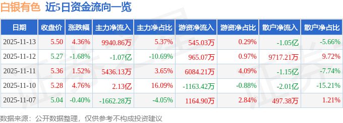 证券之星消息,截至2025年11月13日收盘,白银有色(601212)报收于5.5元,上涨4.36%,换手率4.54%,成交量336.22万手,成交额18.51亿元。