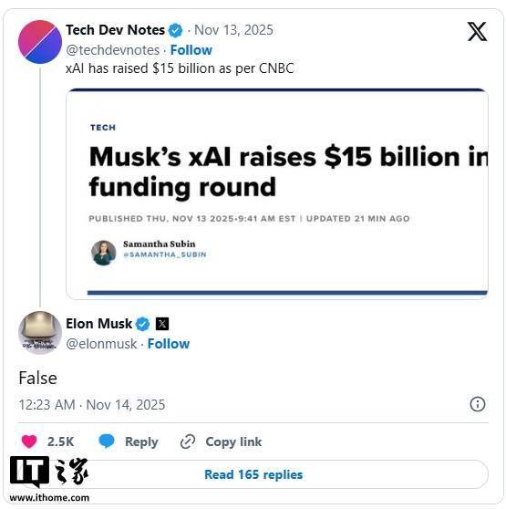 IT之家 11 月 14 日消息,埃隆・马斯克驳斥了有关其人工智能初创公司 xAI 完成 150 亿美元(IT之家注:现汇率约合 1065.06 亿元人民币)融资的报道。该融资传闻最初由 CNBC 报道,该媒体援引了据称熟悉此事的消息人士的说法。