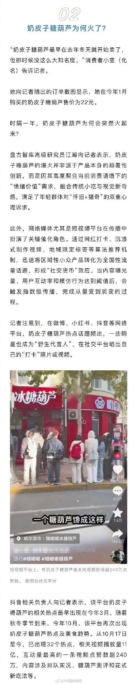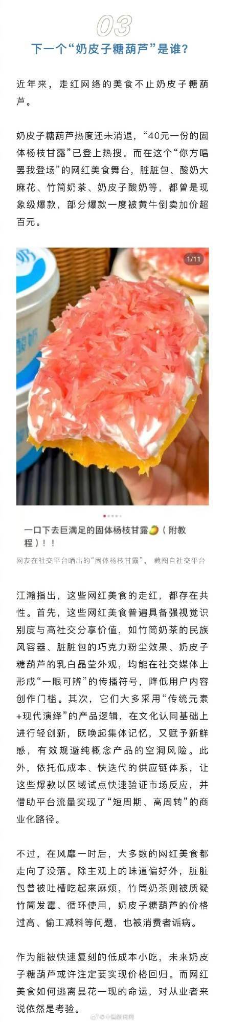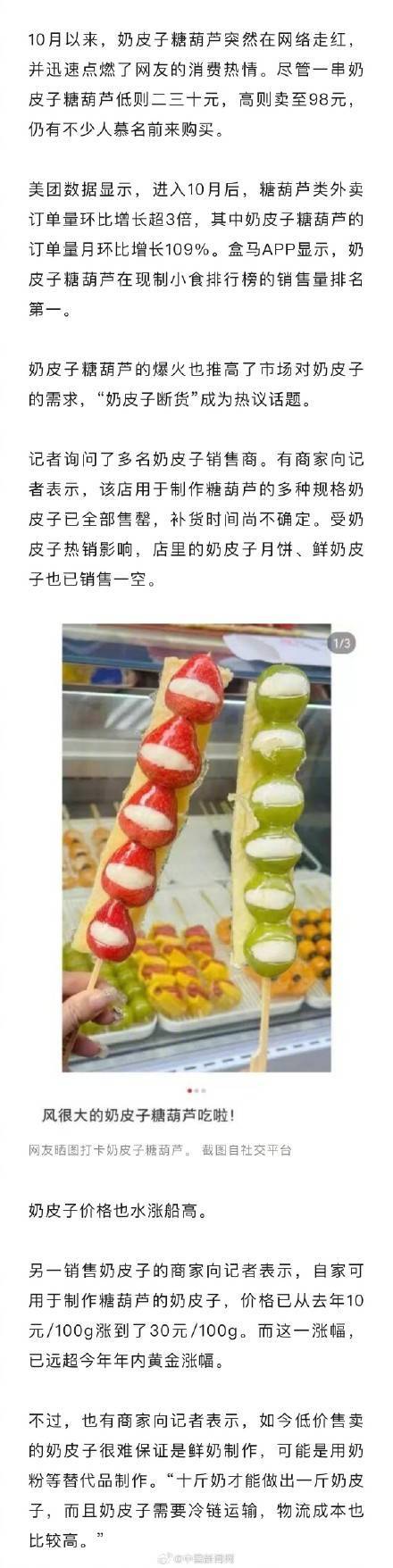随着奶皮子糖葫芦走红,奶皮子也供不应求,价格水涨船高。记者询问了多位奶皮子销售商。有商家表示,店内用于制作糖葫芦的奶皮子已售罄,补货时间尚不确定。另一位商家向记者表示,自家可用于制作糖葫芦的奶皮子,价格已从去年10元/100g涨到了30元/100g。而这一涨幅,已远超今年年内黄金涨幅。不过,也有商家告诉记者,如今低价售卖的奶皮子很难保证是鲜奶制作,可能是用奶粉等替代品制作。“十斤奶才能做出一斤奶皮子,而且奶皮子需要冷链运输,物流成本也比较高。”