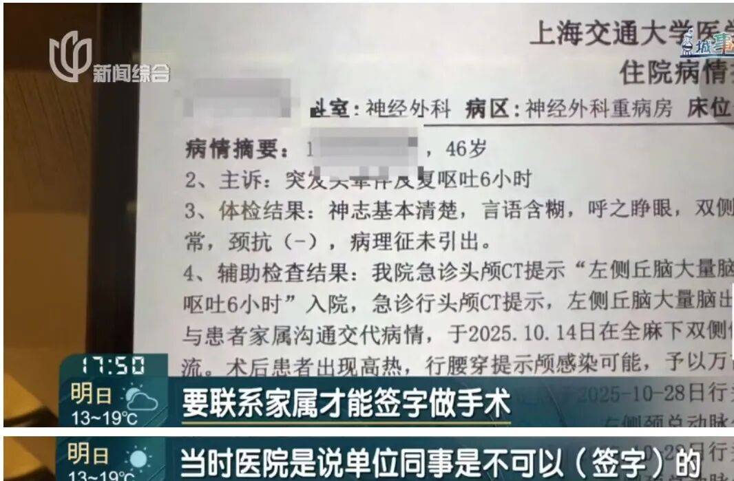 蒋女士的同事上门查看,把蒋女士送到了医院,经诊断,蒋女士出现了脑出血症状,需要进行手术。