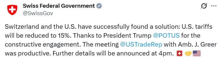 仅一周多后,令伯尔尼官员困扰了大半年的美国关税就降到了15%,与欧盟关税水平持平。也因此,美媒将之称为“金条砸出来的协议”。