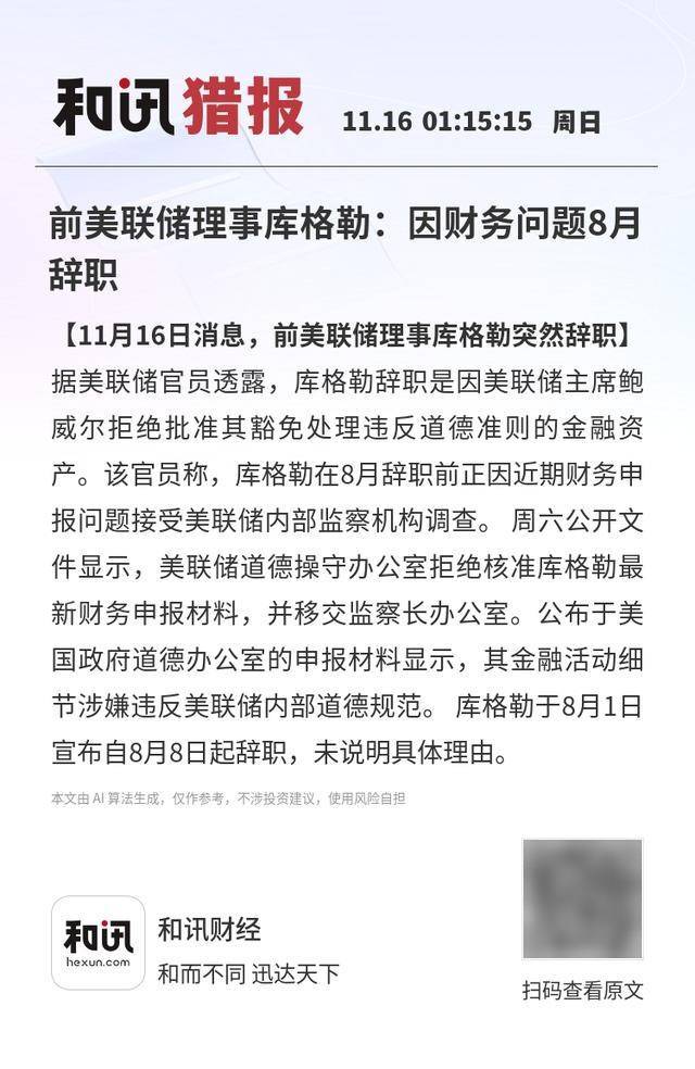【11月16日消息,前美联储理事库格勒突然辞职】据美联储官员透露,库格勒辞职是因美联储主席鲍威尔拒绝批准其豁免处理违反道德准则的金融资产。该官员称,库格勒在8月辞职前正因近期财务申报问题接受美联储内部监察机构调查。 周六公开文件显示,美联储道德操守办公室拒绝核准库格勒最新财务申报材料,并移交监察长办公室。公布于美国政府道德办公室的申报材料显示,其金融活动细节涉嫌违反美联储内部道德规范。 库格勒于8月1日宣布自8月8日起辞职,未说明具体理由。