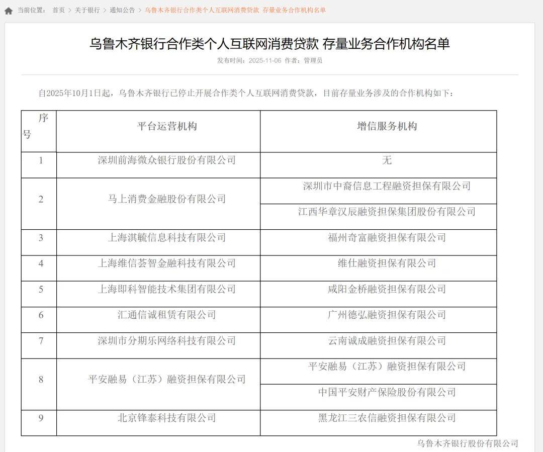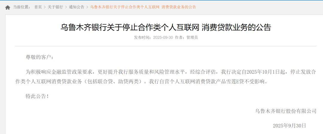 此前,乌鲁木齐银行曾公告称,停止合作类个人互联网消费贷款业务。