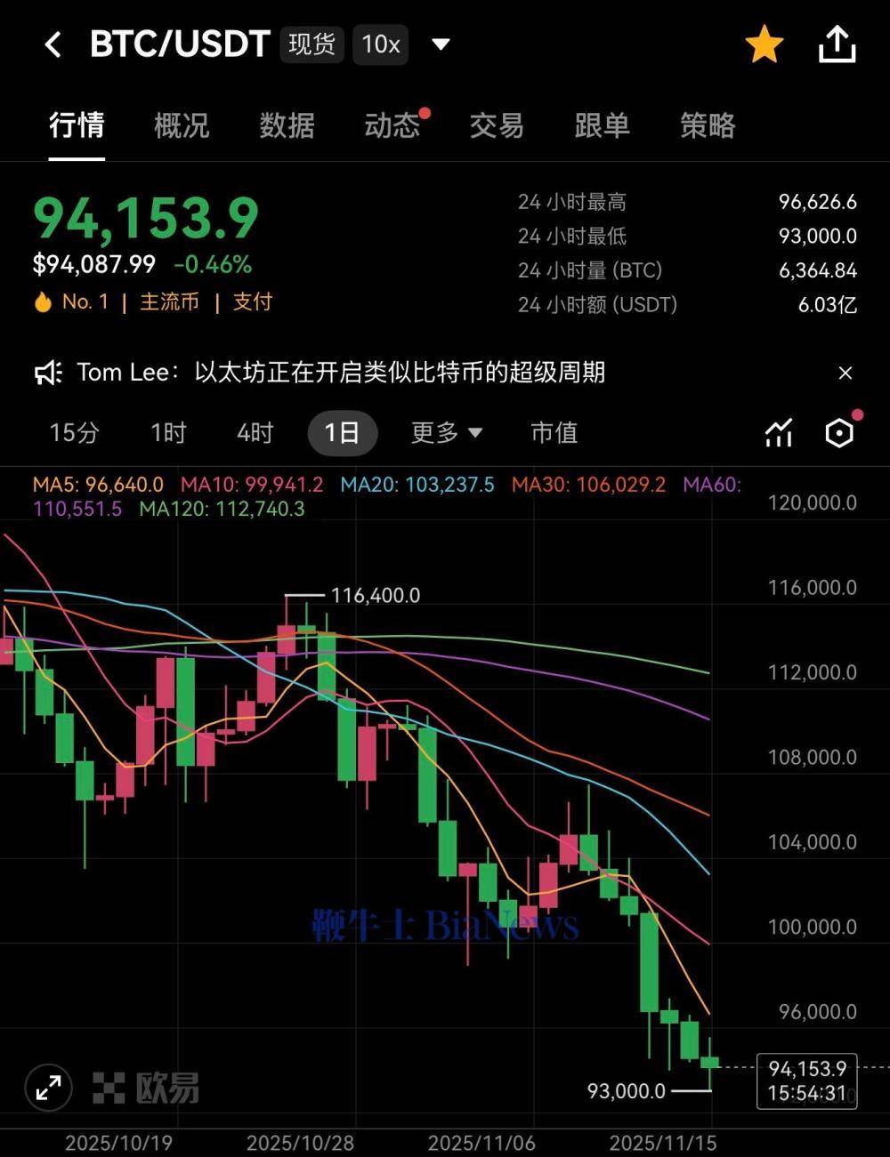 11月17日消息,比特币跌至9.4万美元,抹去今年涨幅,或进入熊市。