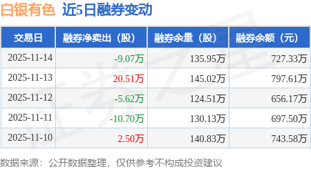 证券之星消息,11月14日,白银有色(601212)融资买入7385.58万元,融资偿还7879.7万元,融资净卖出494.12万元,融资余额4.78亿元。