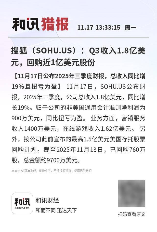 【11月17日公布2025年三季度财报,总收入同比增19%且扭亏为盈】11月17日,SOHU.US公布财报。2025年三季度,公司总收入1.8亿美元,同比增长19%。归于公司的非美国通用会计准则净利润为900万美元,同比扭亏为盈。 业务方面,营销服务收入1400万美元,在线游戏收入1.62亿美元。 另外,按公司此前宣布的最高1.5亿美元美国存托股票回购计划,截至2025年11月13日,已回购760万股,总金额约9700万美元。