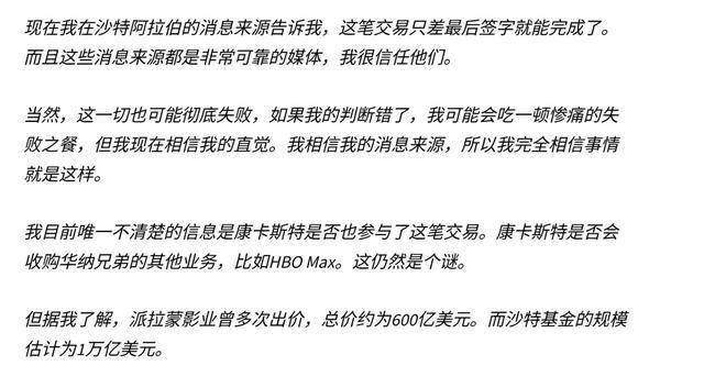 他表示,他的消息来源坚称沙特交易已接近完成,而且时间表与大卫·扎斯拉夫本人暗示的相符:华纳兄弟预计将在12月宣布其新东家。